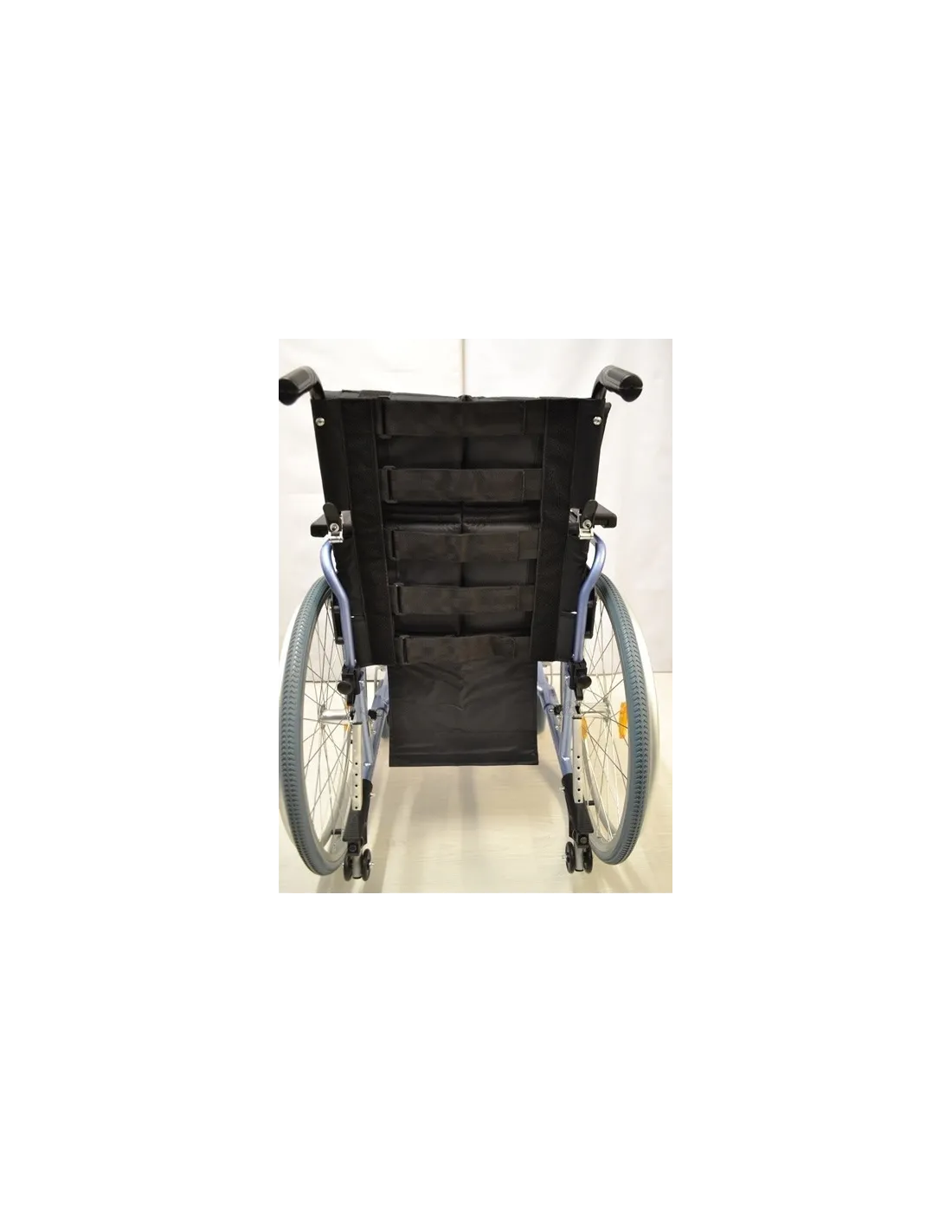 The backrest is tension adjustable with a comfort padded nylon cover to accommodate and support the users back. The back folds down and the rear wheels have quick release mechanisms. The armrests flip away and remove for easy access to the wheelchair.