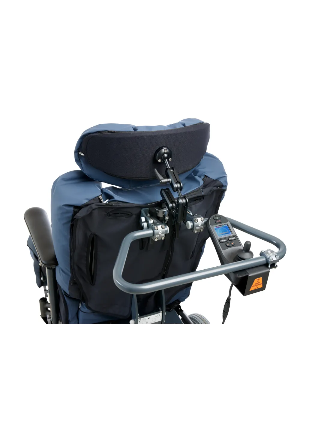 The patient-controlled joystick installed on the supplied swivel bracket allows the wheelchair user to manoeuvre the wheelchair ensuring independence to e.g., participate in activities.